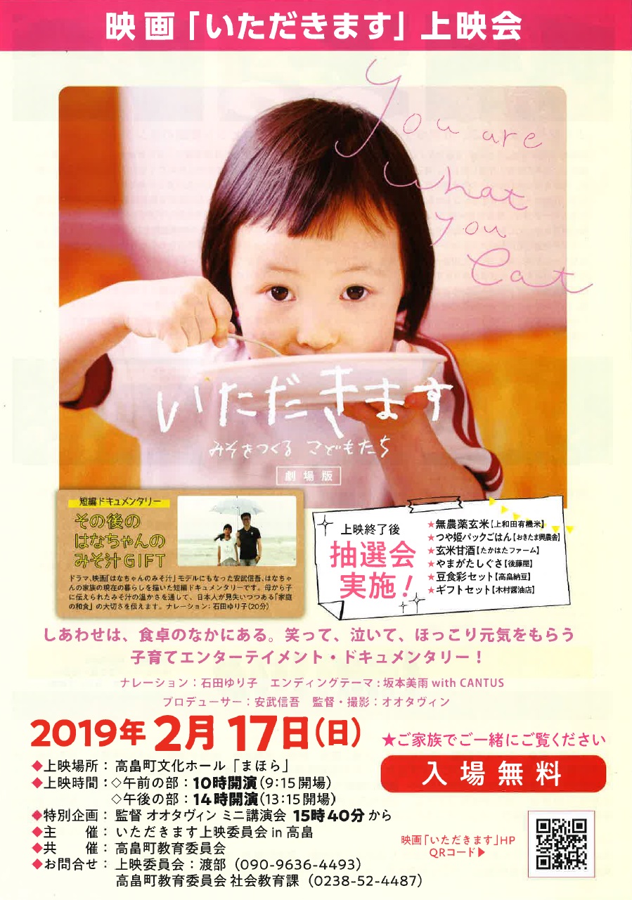 【日にち】 平成31年2月17日(日)【会 場】 高畠町文化ホール ホール【上映時間】 午前の部 10:00 開演 (9:15 開場)午後の部 14:00 開演 (13:15 開場)【特別企画】 監督・オオタヴィン ミニ講演会 15:40〜【料 金】 入場無料【問合せ先】 上映委員会(渡部)090-9636-4493高畠町教育委員会 社会教育課 0238-52-4487【主 催】 いただきます上映委員会in高畠