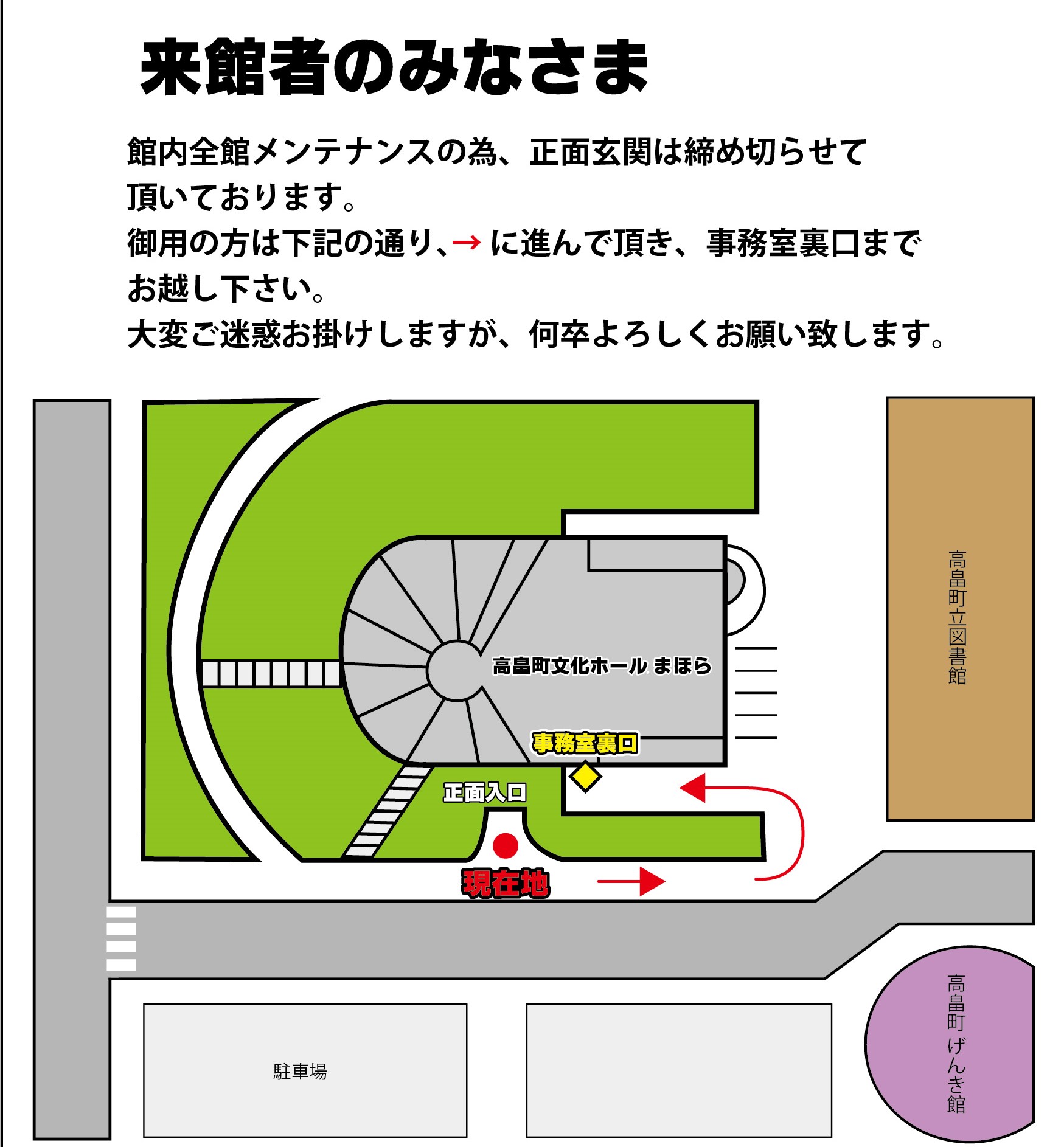 臨時休館日のお知らせ高畠町文化ホールの館内メンテナンスにより下記の期間臨時休館とさせて頂きます臨時休館日:8月9日(火)より8月15日(月)期間中、正面玄関からの入館は行えませんので、事務所への御用の際は事務所入口よりお廻り下さい。事務所入り口の場所が分からない方は高畠町文化ホール事務室(TEL 0238-52-4489)までご連絡ください。また、8月13日(土)〜14日(日)は完全休館の為、事務室も空いておりません。何卒、ご理解の程よろしくお願い致します。